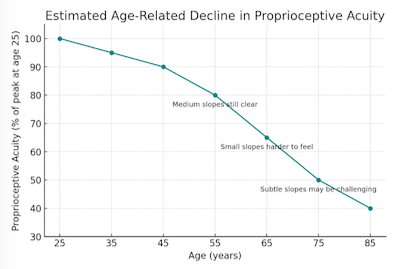 Taking the published literature and trying to generate a n overview of the impact of ageing on the general population is not easy. Methodological issues abound and it is certainly the case that the amount and rate of proprioceptive decline is hugely variable. However utilising ChatGPT to summarise the published literature I generated this overview figure that provides a rough perspective on age-related proprioceptive loss. It should not be seen as an unimpeachable description of the real world but a crude model (an estimate) of age-relate change. It is a trend line about which there is considerable noise.