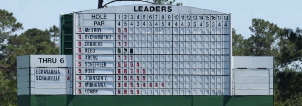 The final hole at Augusta is lined with towering pines, framing a narrow corridor to the fairway that is quite steeply uphill. Two good shots left him just short of the green. A chip and two puts followed. Bogey five but a one shot win.